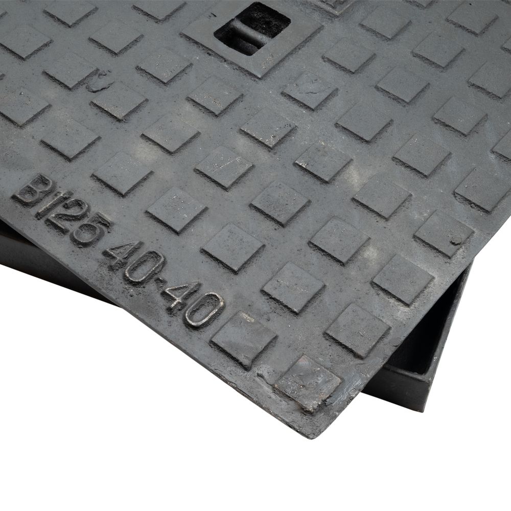 Couvercle en fonte avec cadre et couvercle carrés. Anti-dérapant avec fermeture hydraulique. Fonte ductile conforme à la norme EN 124-1 - B125. |