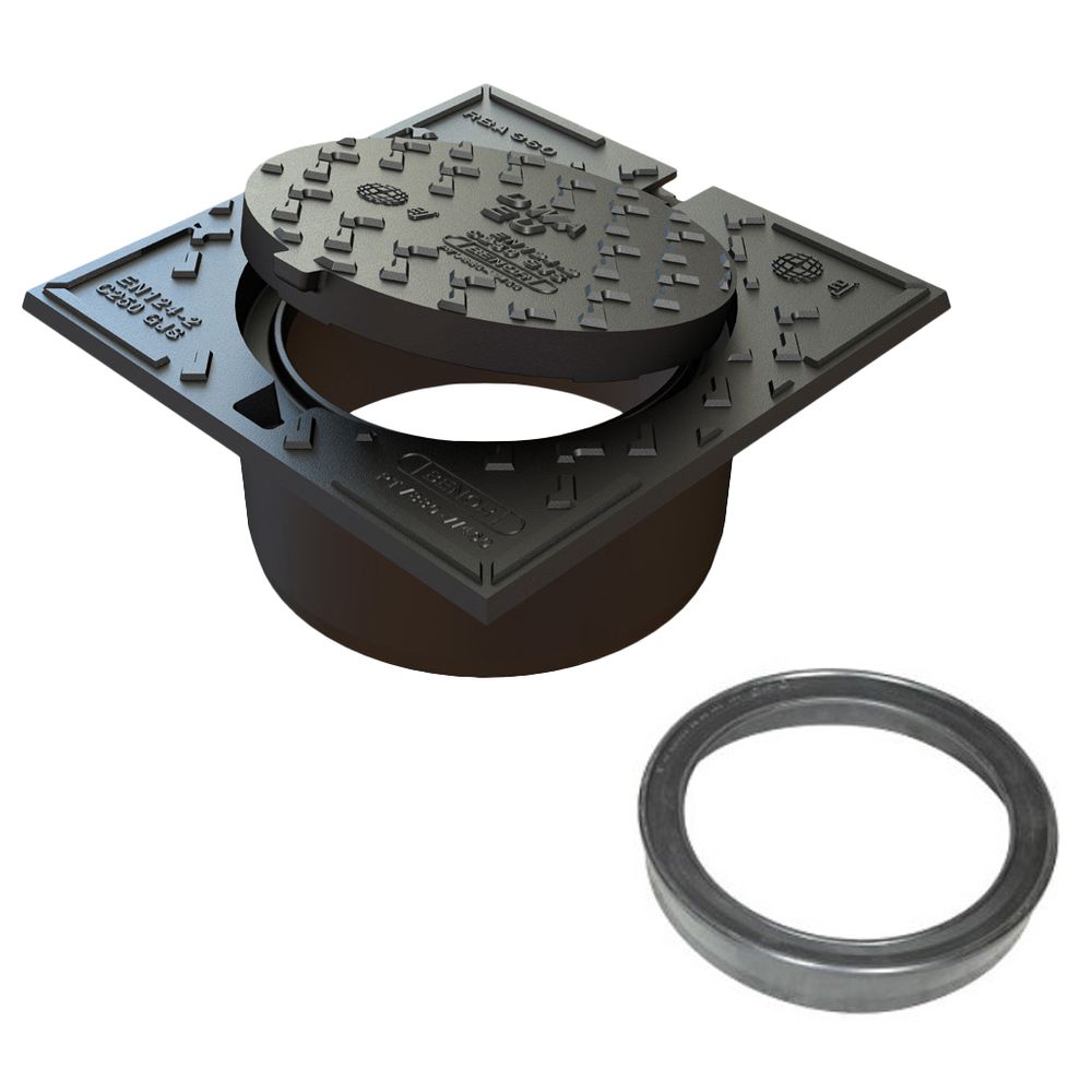 Couvercle de raccordement avec fente hydraulique, avec jupe et bague de raccordement en EPDM pour le raccordement à un tuyau en PVC. Fente hydraulique (égale ou supérieure) 6 mm Cadre carré / couvercle rond Caoutchouc élastomère réglable en hauteur Installation dans le béton ou l'asphalte Peinture noire à base d'eau selon SB 250 version 4.1