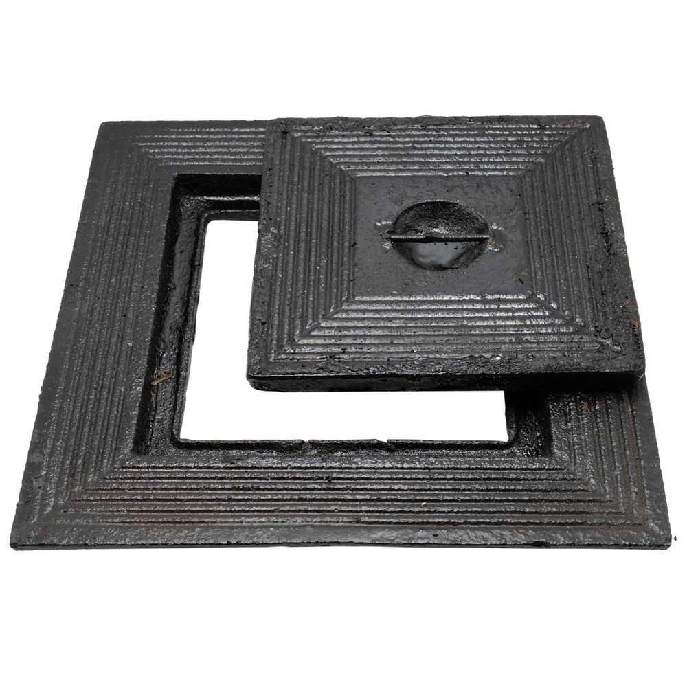Gietijzeren deksel, sluiting d.m.v. tand- en groef. Voorzien van centrale uitlichtkom. |